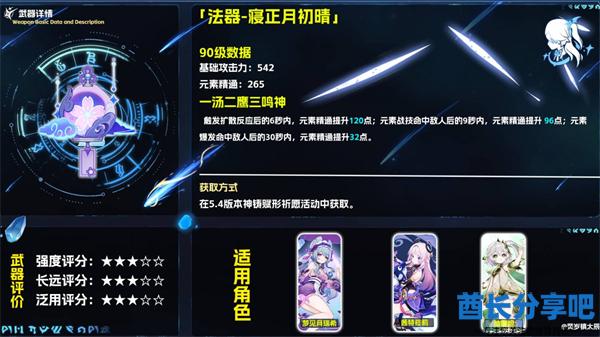优点:寝正月初晴是一把专精于提升元素精通的法器,对于那些依赖精通的角色(特别是风元素角色)来说,能够极大提升其反应伤害,适合梦见月瑞希、砂糖等角色。