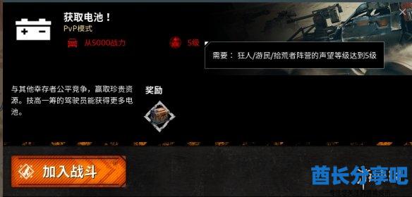 3、获取电池:需要玩家狂人/游民/拾荒者任意一个阵营声望达到5级,且需要组装一台战斗力达到8000的战车。
