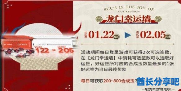 3、龙门幸运墙:每天可获得200~800合成玉,活动期间累计可获取约8000合成玉。