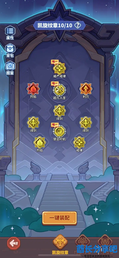 3、纹章搭配:优先选用阔剑纹章,其提供的攻击力比烈焰和戒律大约高7%;除锋利物刃(1.5倍加成)外,其他推荐选择阔剑;第二页以洞察为主,也可选用惩击,同样是增强英雄攻击力;第三页选择号角,相比交错等,可提升大约5%的全员攻击力(即绿字部分)。