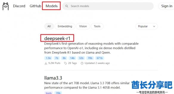 2、进入Ollama官网,右上角的Models,找到deepseek-r1。