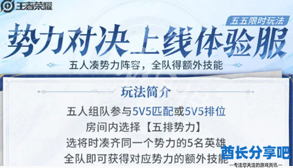 2、同时,五五开黑节期间还会上线全新限时玩法【势力对决】,玩家可以在5v5匹配或排位模式体验。