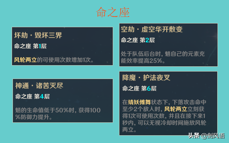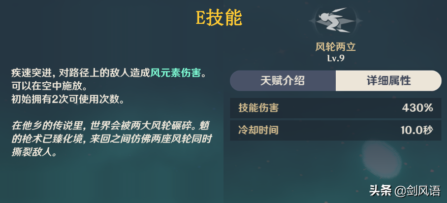 1.E技能,初始有2段,每1段产3个风元素微粒,解锁1命后,增加至3段,解锁六命后,该技能也可以当成输出手法之一。E技能,可以半空位移,开荒世界也可以用得着,手感极佳,基本没什么前摇,伤害倍率可观。