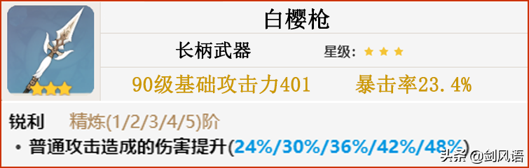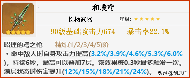 目前长柄武器基础攻击力颇高,副属性又是加暴击率,再加上自身突破增加的暴击率,一共46.3%暴击率,大幅度降低了圣遗物叠暴击率属性的需求,被动命中敌人增加攻击力,同时叠满7层提升造成伤害。无论在输出,还是外观上,都是十分契合魈的武器。