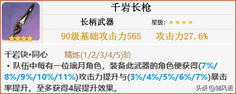 核心是被动,可以提升44%攻击力和28%暴击率,基本上碾压其他四星武器,但需要搭配璃月角色,而魈刚好是璃月角色,再搭上3个璃月角色,便可以吃满被动。